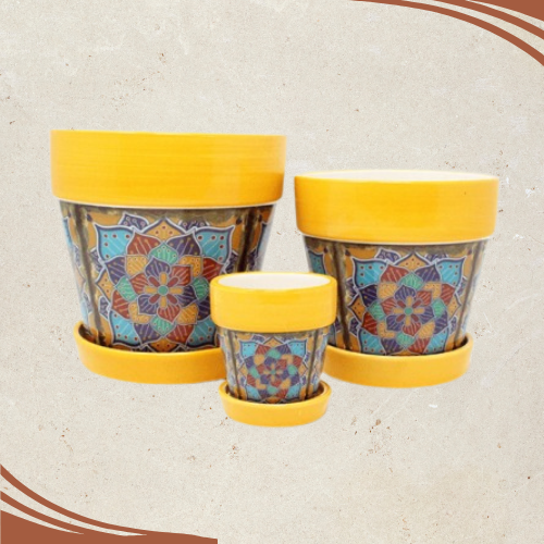 Iluminá tus espacios con estas macetas de cerámica esmaltada llenas de color y energía. Su diseño inspirado en mosaicos artesanales y el borde amarillo vibrante las convierte en el complemento ideal para resaltar tus plantas y dar vida a cualquier rincón.