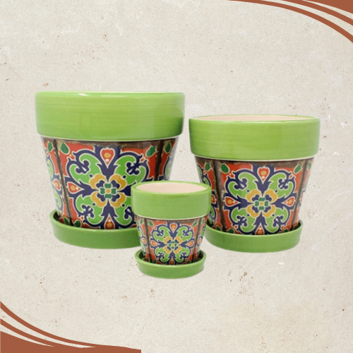 Llená tu casa de frescura y color con estas macetas de cerámica esmaltada. Su diseño con motivos florales y borde verde vibrante aporta alegría y un toque natural a cualquier ambiente, ideal para resaltar tus plantas favoritas.